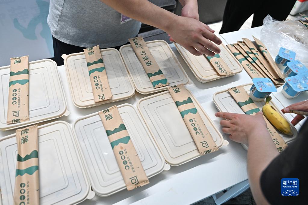 4月11日,在消博會就餐區(qū),與會者領(lǐng)取用可降解餐盒包裝的午餐。