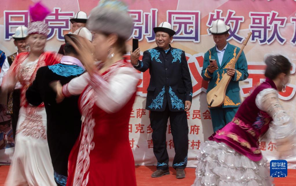 4月10日,在別迭里村,阿不都別克(右三)在拍攝舞蹈表演。