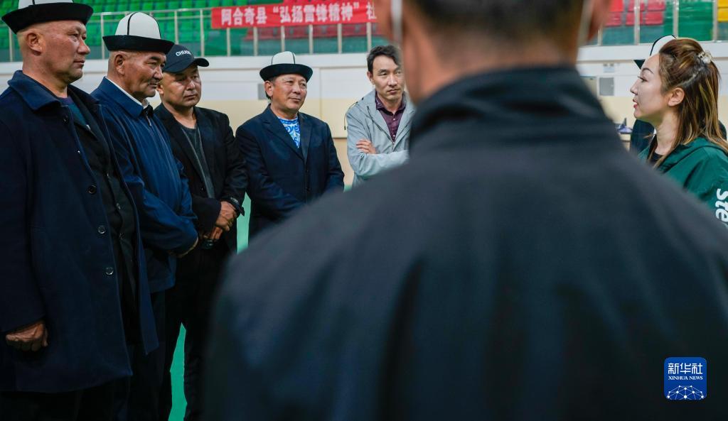 4月10日,在阿合奇縣科技文化體育中心,阿不都別克(左四)在進(jìn)行彩排。