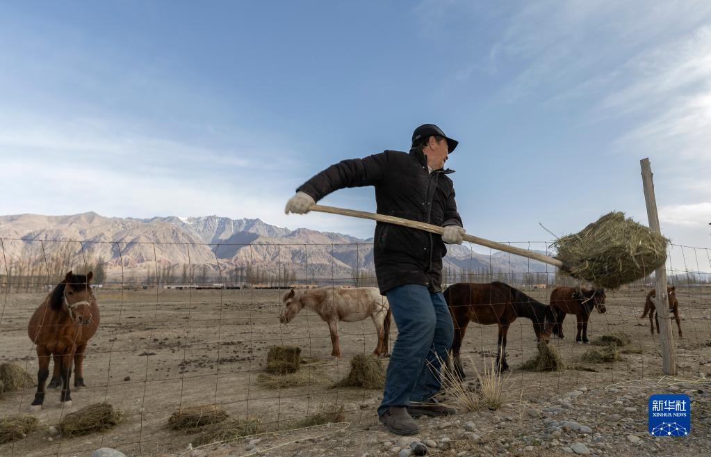 4月10日清晨,在阿合奇村,阿不都別克在喂馬。