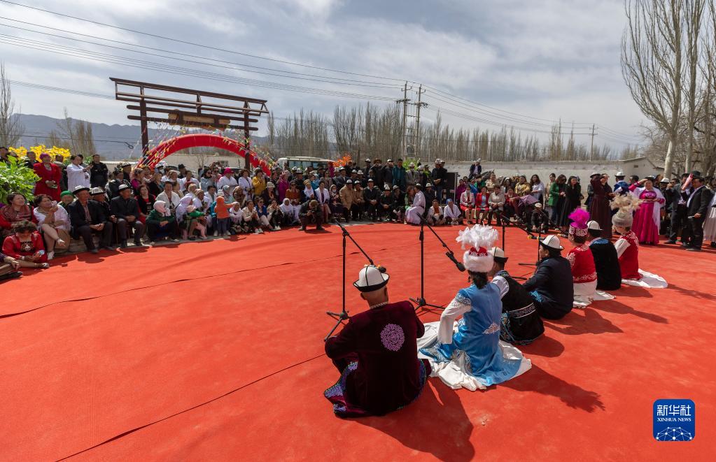 4月10日,在別迭里村,觀眾在觀看阿不都別克(前排左四)和同伴的表演。