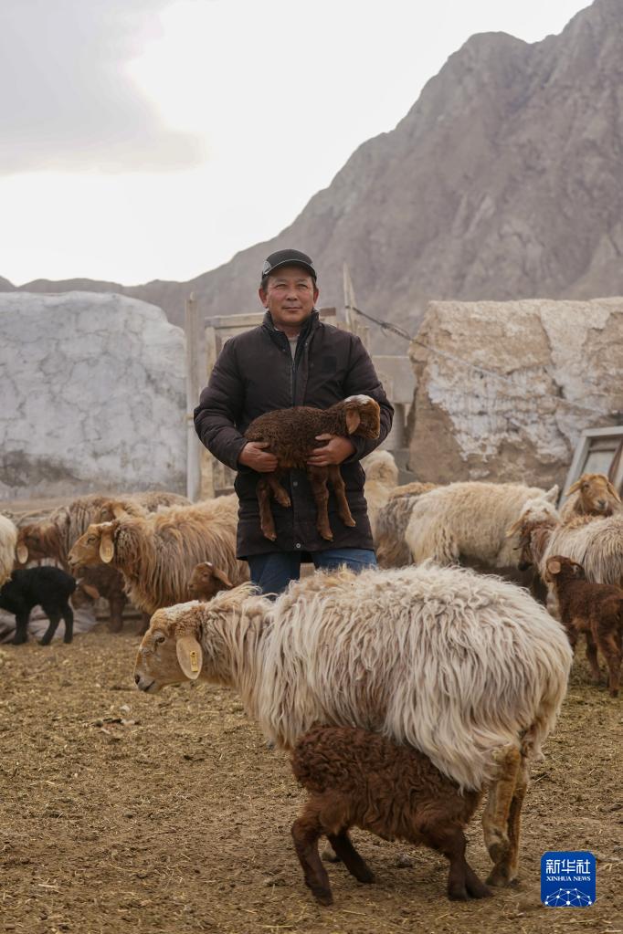 4月10日,在阿合奇縣哈拉奇鄉阿合奇村,阿不都別克抱著小羊羔走在羊圈里。