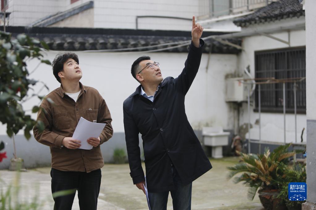 4月6日,彭銳在江蘇省蘇州市高新區通安鎮樹山村與其團隊走訪村民宅院,規劃下一步設計。 新華社記者 柳文惠 攝