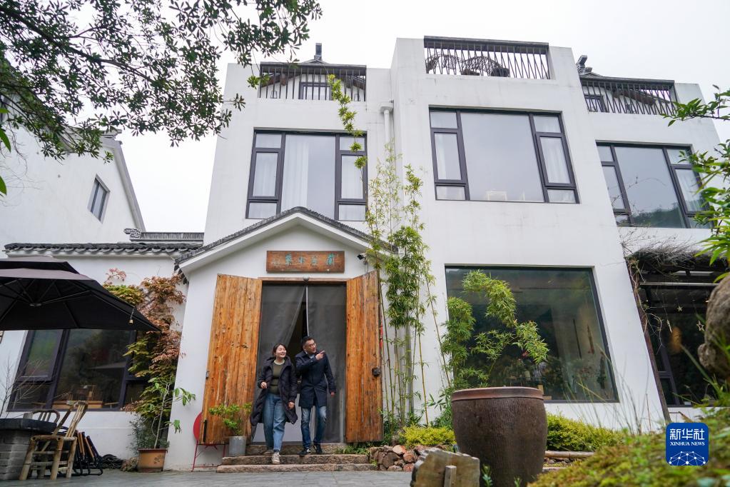 4月6日,在樹山村里的民宿“蘭兮小筑”,彭銳(右)和老板俞慧聊天交流。 新華社記者 李博 攝