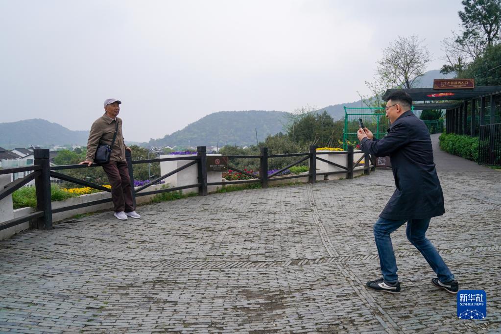 4月6日,彭銳(右)在樹山村觀景平臺為一位游客拍照留念。 新華社記者 李博 攝