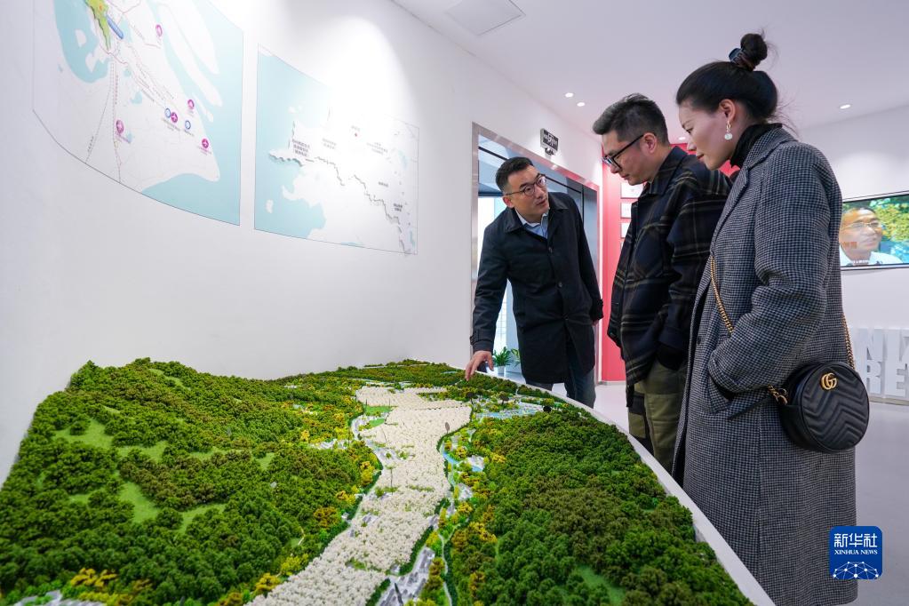 4月6日,在樹山村鄉村雙創中心,彭銳(左)為前來咨詢的客戶介紹樹山村基本情況。 新華社記者 李博 攝