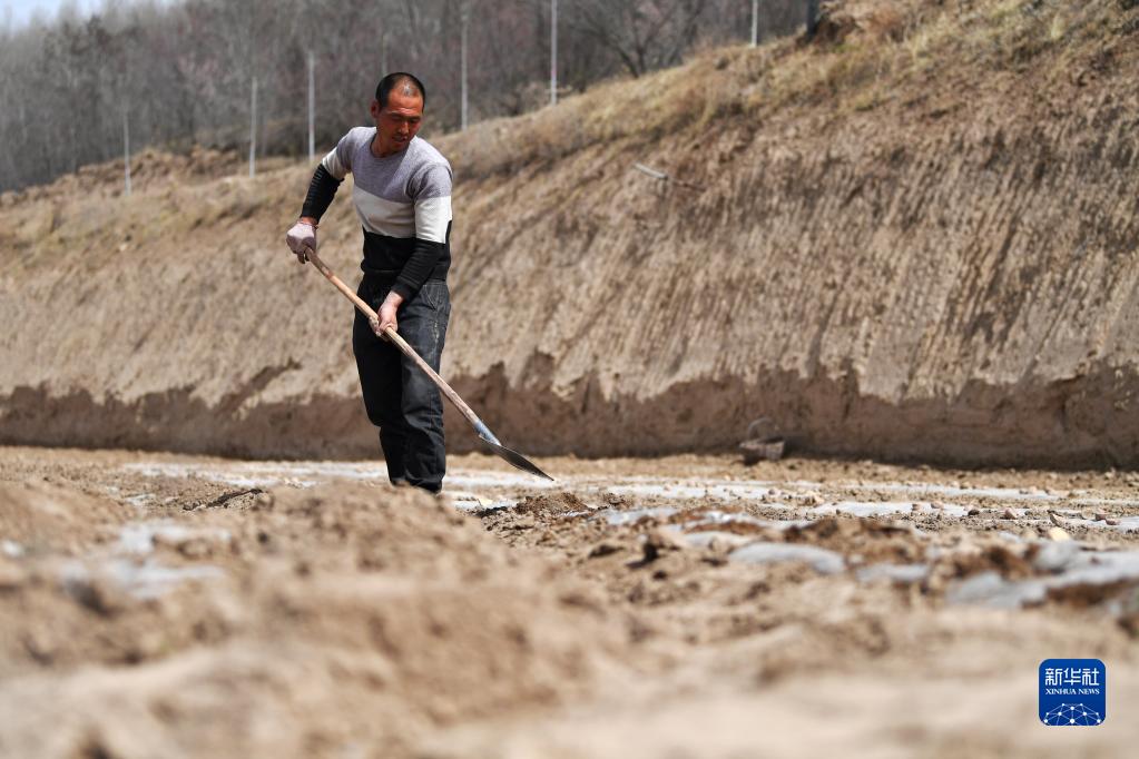4月11日,在靜寧縣紅寺鎮胡溝村,一名村民在高標準農田里勞作。