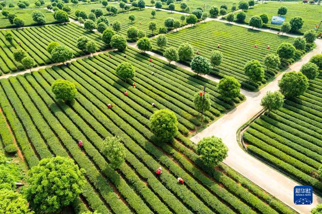 4月11日,在長(zhǎng)沙望城烏山貢茶基地,茶農(nóng)采摘春茶(無(wú)人機(jī)照片)。
