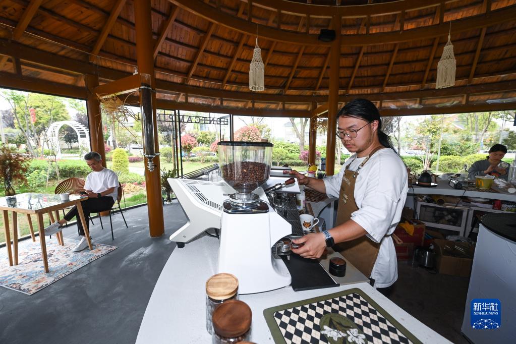 4月11日,工作人員在伍浦村漁耕文化園的陶灣里鄉村咖啡店工作。