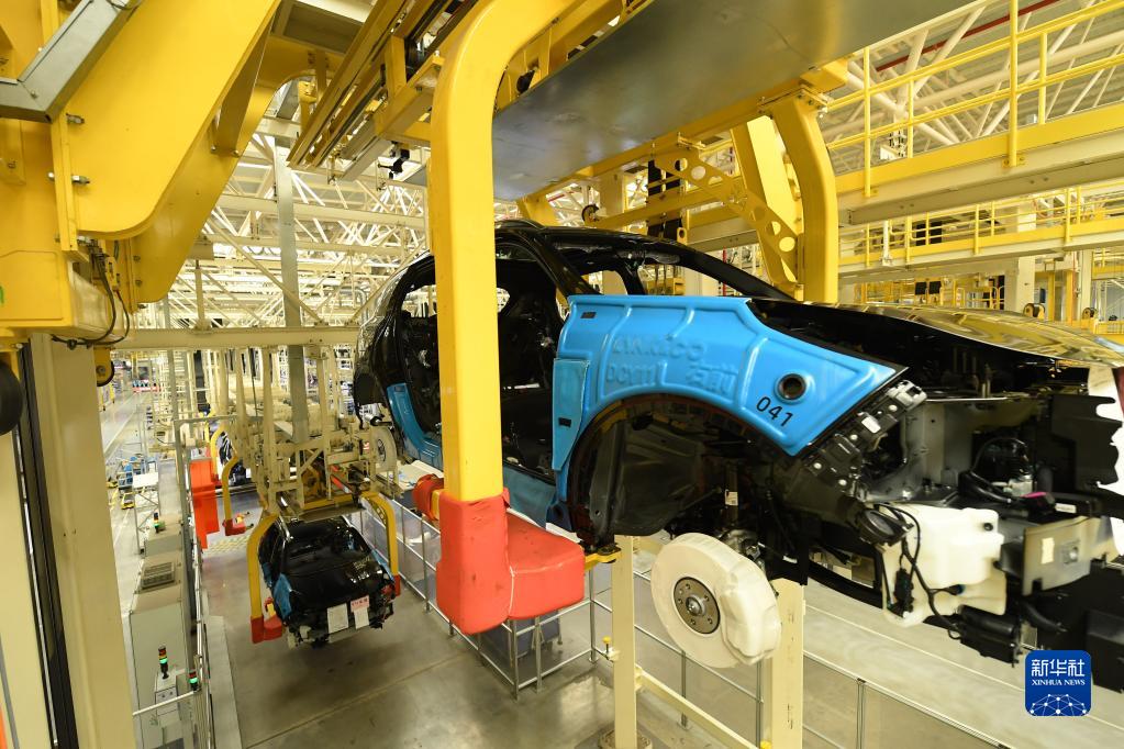 4月11日,在領克汽車寧波余姚工廠總裝車間,全自動生產線將新能源車運送到下一個環節。