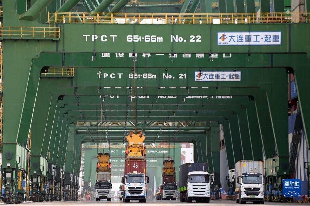 4月11日,卡車在天津港太平洋國(guó)際集裝箱碼頭運(yùn)輸集裝箱。