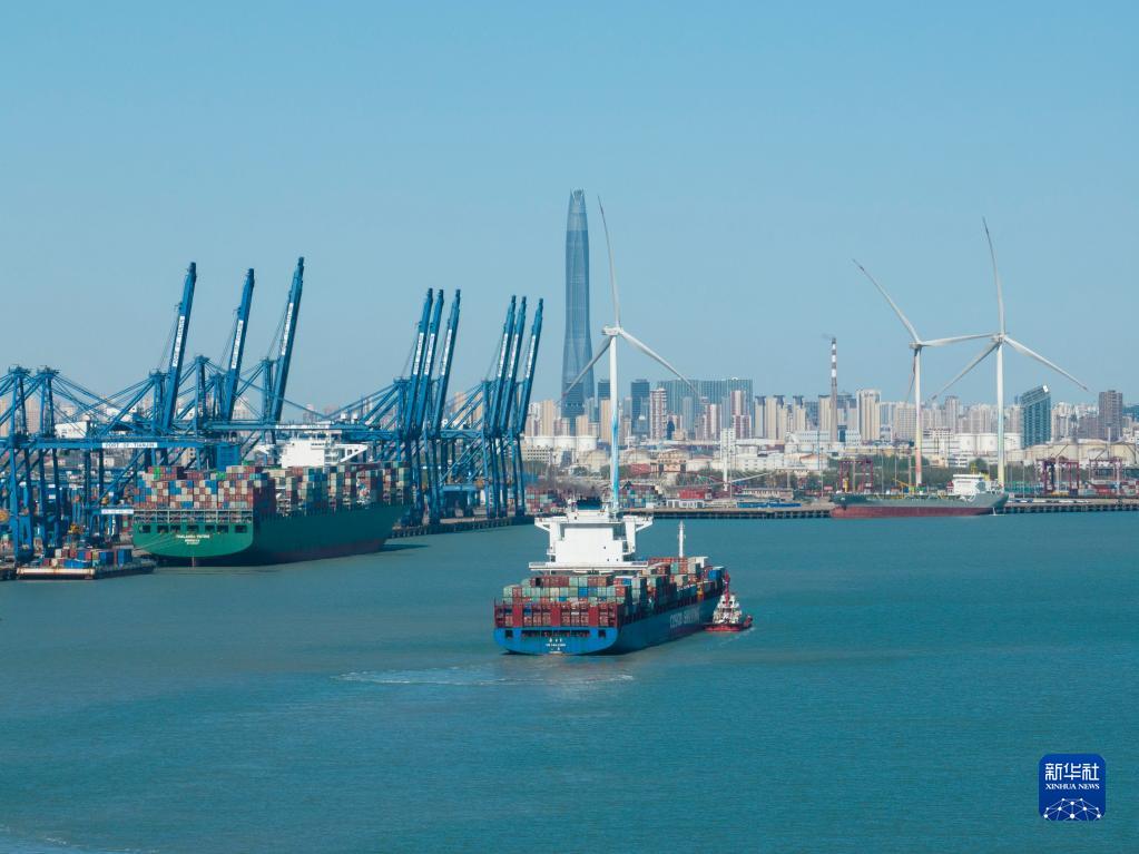 一艘貨輪在天津港航道行駛(4月7日攝,無人機(jī)照片)。