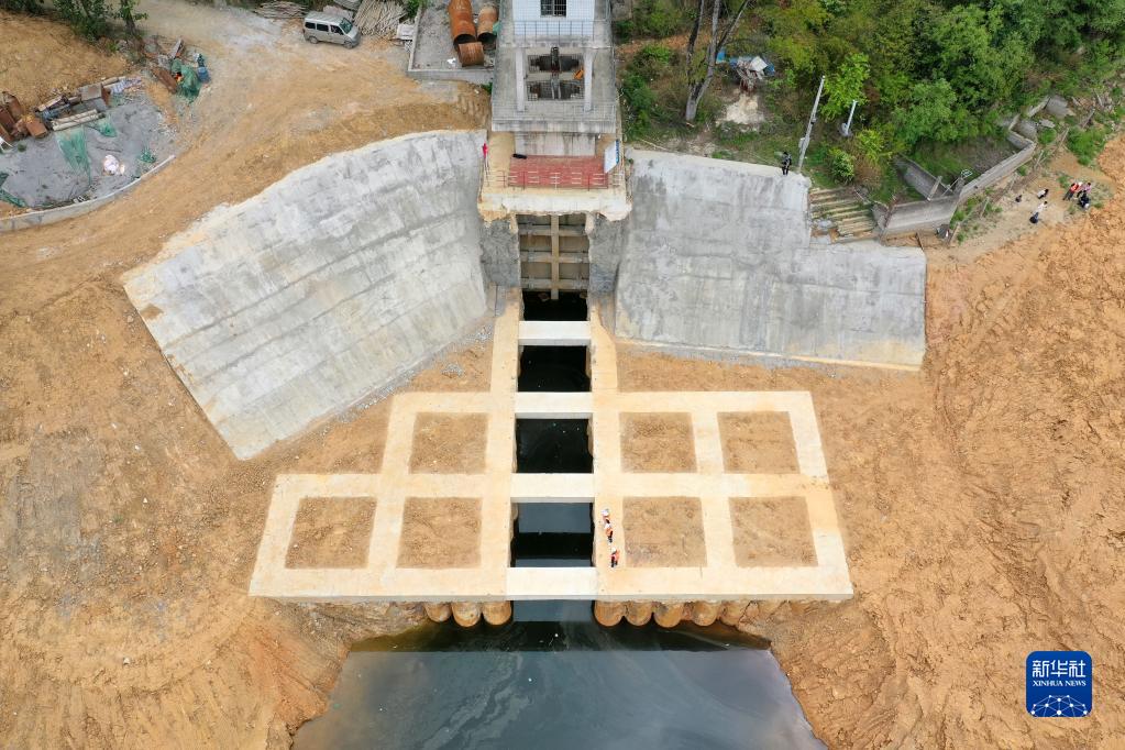 4月11日,工作人員在阿哈水庫新建的放空洞設施上巡查(無人機照片)。