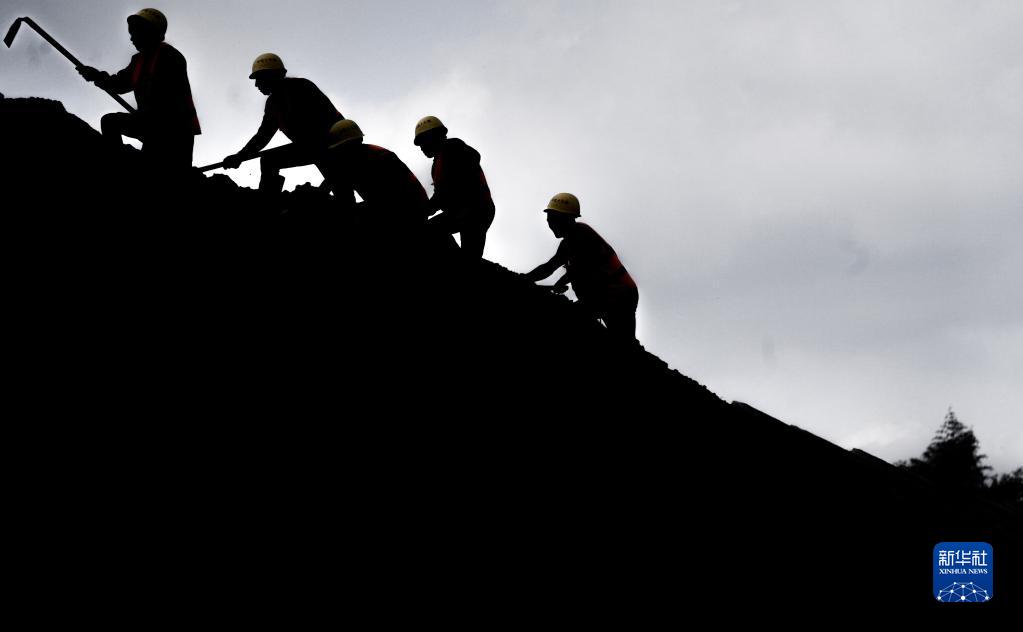 在梁開高速梁平段施工現場,工人在修筑邊坡(2023年3月20日攝)。