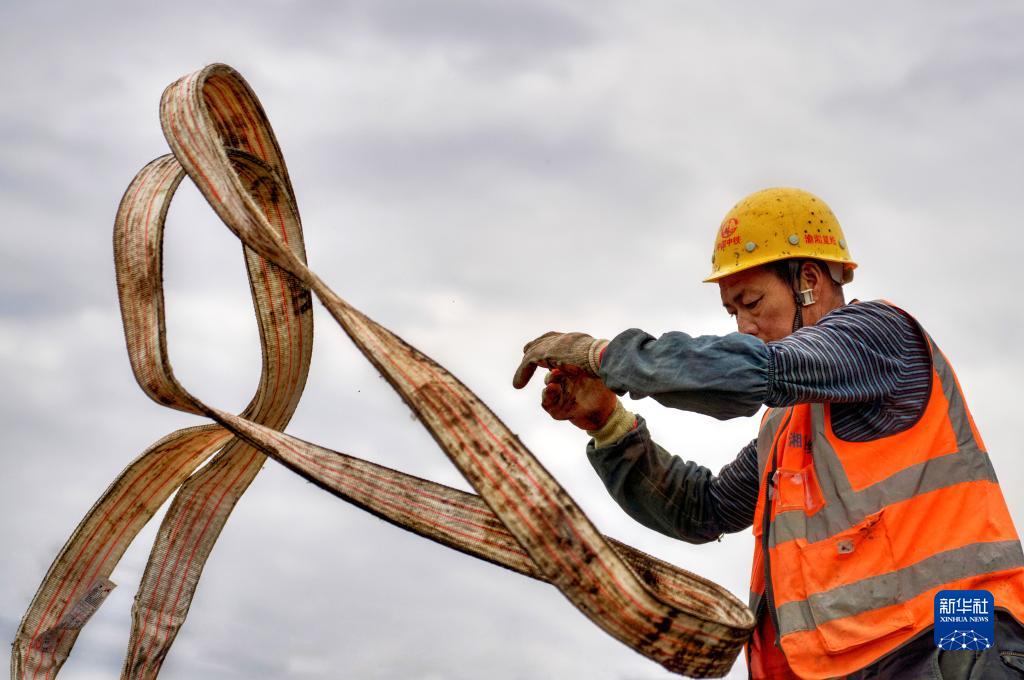 在渝湘復線高速南川段,工人在準備吊裝作業(2023年3月27日攝)。
