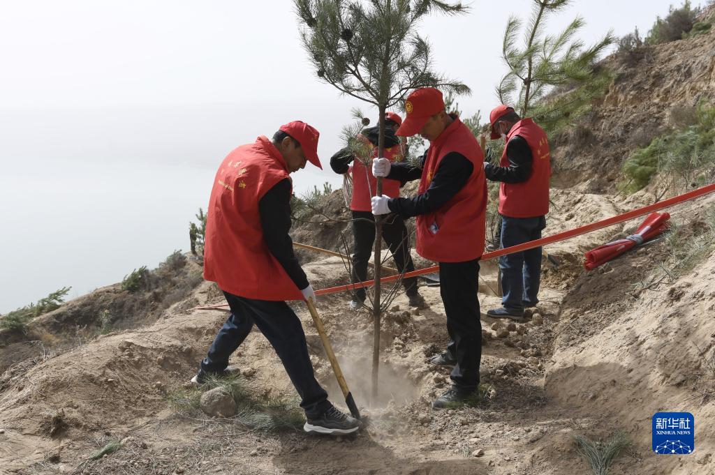 4月11日,人們在黃河劉家峽水庫岸邊植樹。