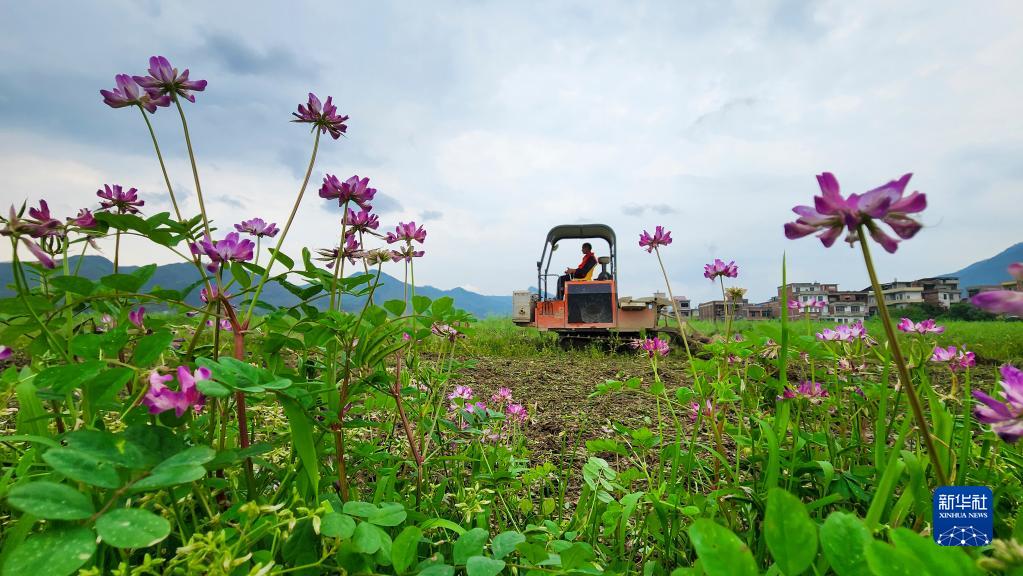 4月11日,在常寧市洋泉鎮杉樹村,科技特派員駕駛農機幫助村民翻耕農田。