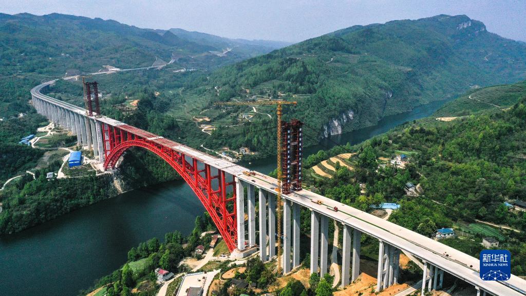 這是4月11日拍攝的德余高速烏江特大橋建設現場(無人機照片)。