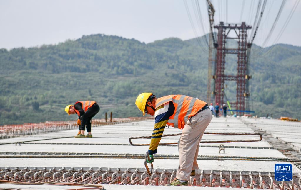 4月11日,工人在德余高速烏江特大橋上施工。