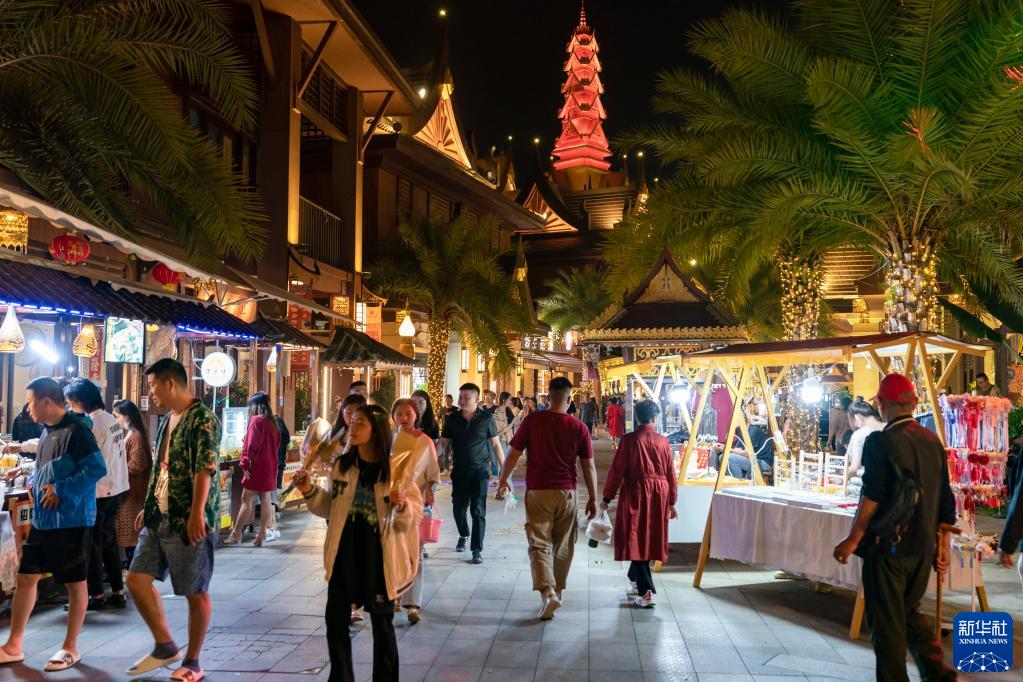 華燈初上,位于云南省德宏傣族景頗族自治州芒市的傣族古鎮逐漸熱鬧起來。作為2022年國家文化和旅游部確定的第二批國家級夜間文化和旅游消費集聚區之一,這里極具特色的少數民族建筑、服飾、舞蹈、美食吸引著人們流連忘返。