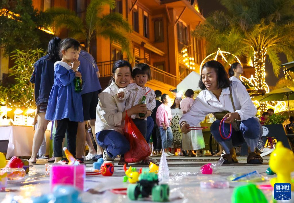 4月11日,游客在芒市傣族古鎮(zhèn)中玩套圈游戲。