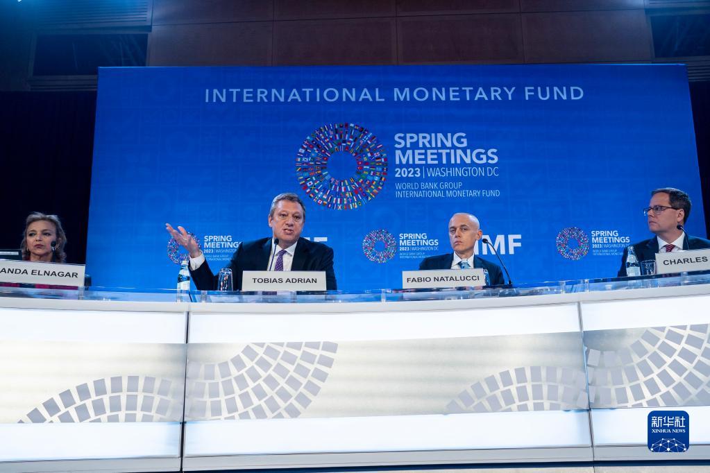4月11日,在美國華盛頓,IMF貨幣與資本市場部主任托比亞斯·阿德里安(左二)出席記者會。