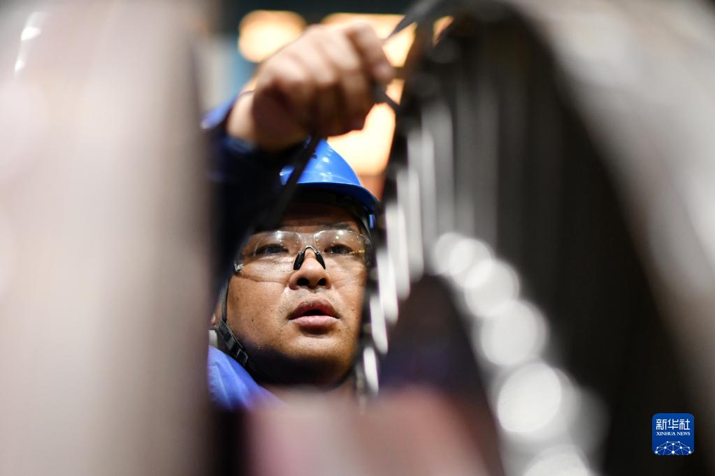 4月10日,工人在哈電集團哈爾濱汽輪機廠有限責任公司車間內生產作業。