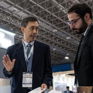 4月11日,在巴西里約熱內盧舉行的2023拉丁美洲航空航天與防務展(又稱巴西防務展)上,參觀者在同方威視技術股份有限公司展臺交談。
