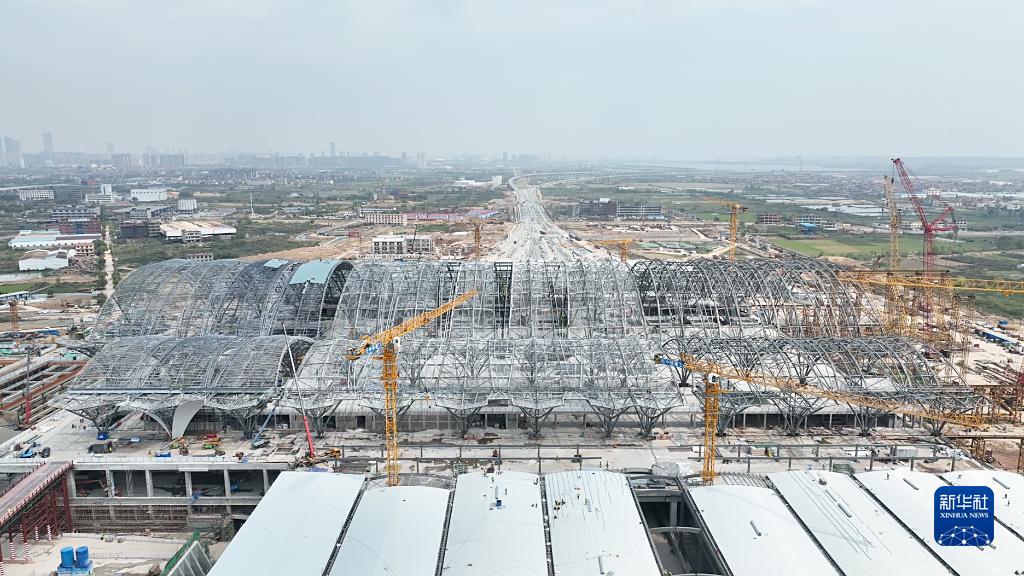 4月12日拍攝的在建的南昌東站站房工程外景(無人機照片)。