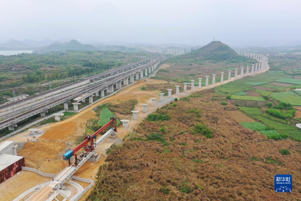 4月12日,工作人員在尖坡寨特大橋使用架梁機進行預制梁架設(無人機照片)。
