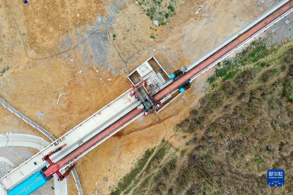 4月12日,工作人員在尖坡寨特大橋進行預制梁架設施工(無人機照片)。
