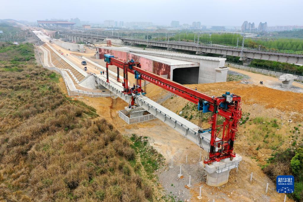 4月12日,工作人員使用架梁機(jī)進(jìn)行預(yù)制梁架設(shè)(無(wú)人機(jī)照片)。