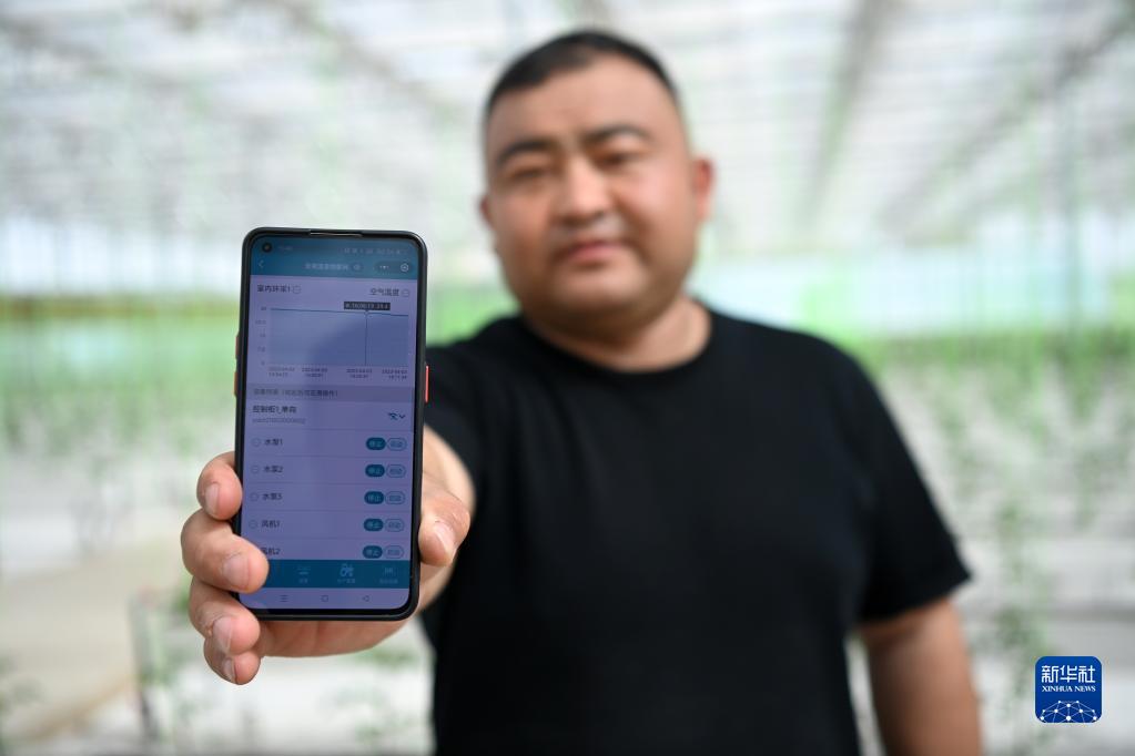 在張掖市甘州區黨寨鎮陳寨村玻璃智能溫室內,工作人員展示手機上的智能溫室操控系統(4月10日攝)。
