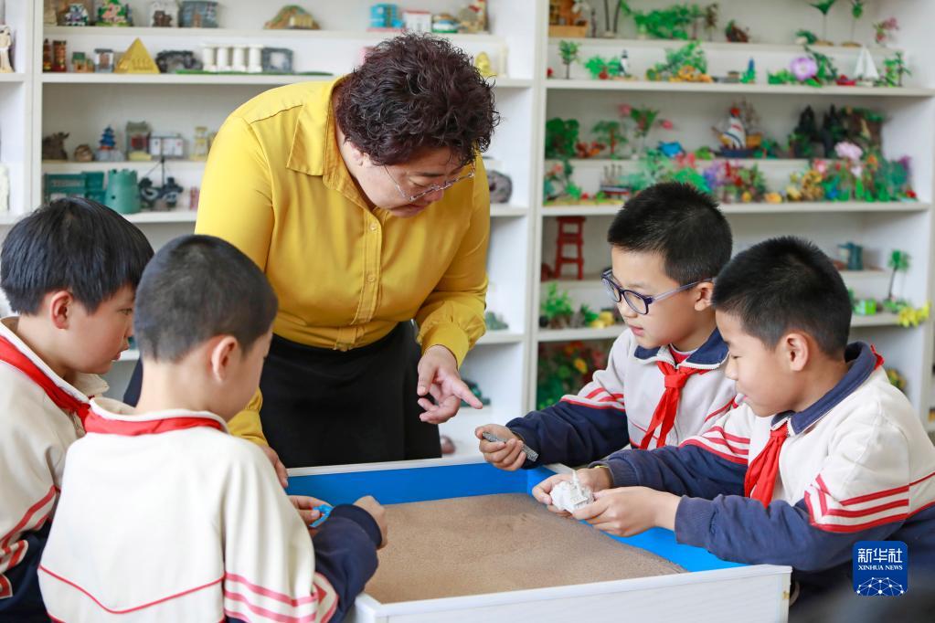 4月12日,大連市西崗區(qū)工人村小學的心理教師在心理輔導(dǎo)室陪學生一起擺放沙盤。