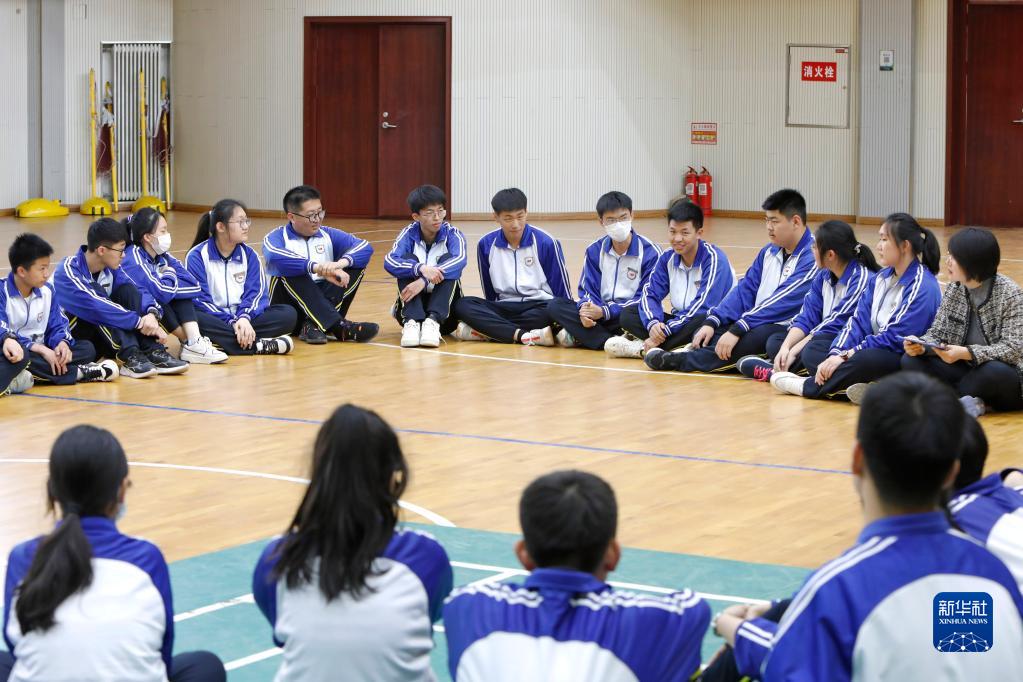 4月12日,大連市第十一中學的心理教師在體育館給學生上心理團體輔導課。