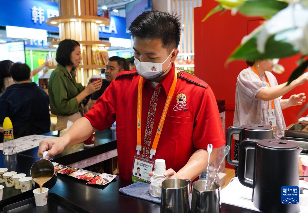 4月12日,工作人員在為參觀者沖泡一款產(chǎn)自印尼的咖啡。
