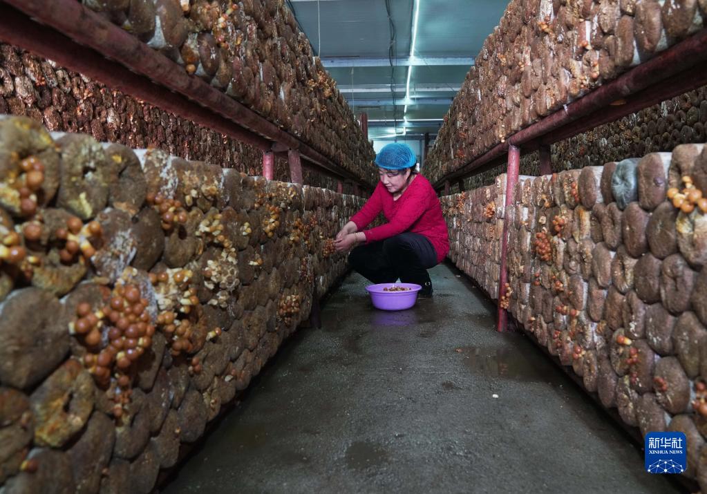 4月12日,工人在青龍滿族自治縣婁杖子鎮獅子坪村食用菌種植基地采摘滑子菇。