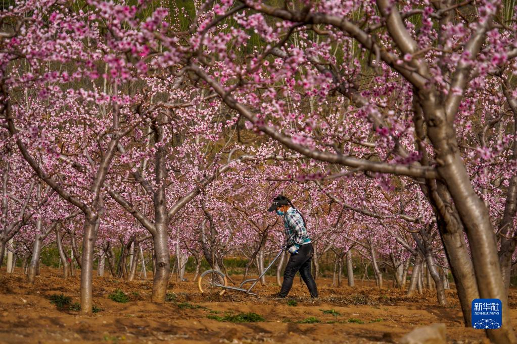 4月12日,河北省遵化市東舊寨鎮五虎嶺村農民在桃樹果園勞作。