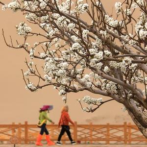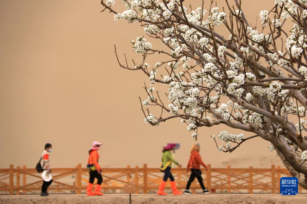 近日,甘肅省敦煌市鳴沙山月牙泉景區內的桃花、梨花、丁香花競相綻放,別有一番韻味。