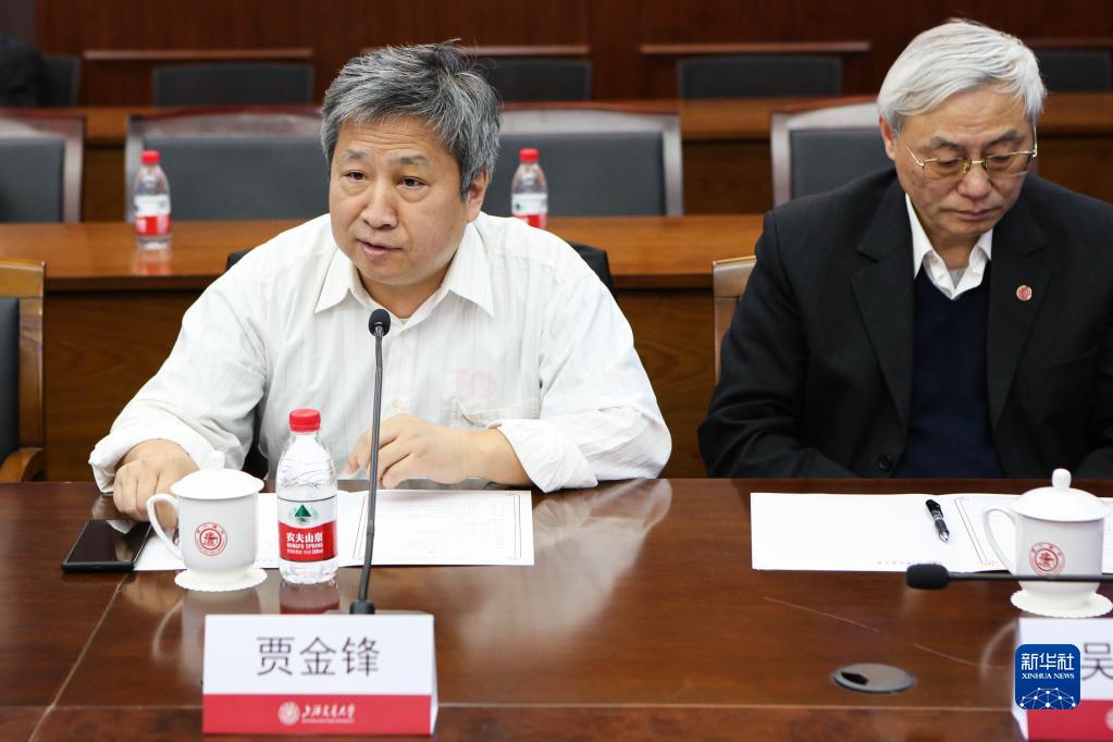 4月12日,中國科學(xué)院院士、上海交通大學(xué)物理與天文學(xué)院教授賈金鋒(左一)介紹“實驗證實超導(dǎo)態(tài)‘分段費米面’”成果整體情況。