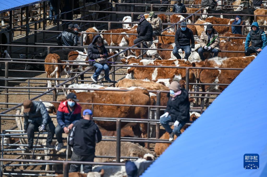 4月12日,內蒙古通遼市科爾沁左翼中旗舍伯吐鎮成峰牲畜交易市場里一片繁忙景象,1000余輛貨運車整齊排列,1萬余頭黃牛正等待被交易。據介紹,這個交易市場年交易80萬頭肉牛,交易額可達80億元。今年以來,當地牛市行情逐漸轉好,來自遼寧、吉林、山東等地的買家再次聚集于此,帶動了養殖戶增收。
