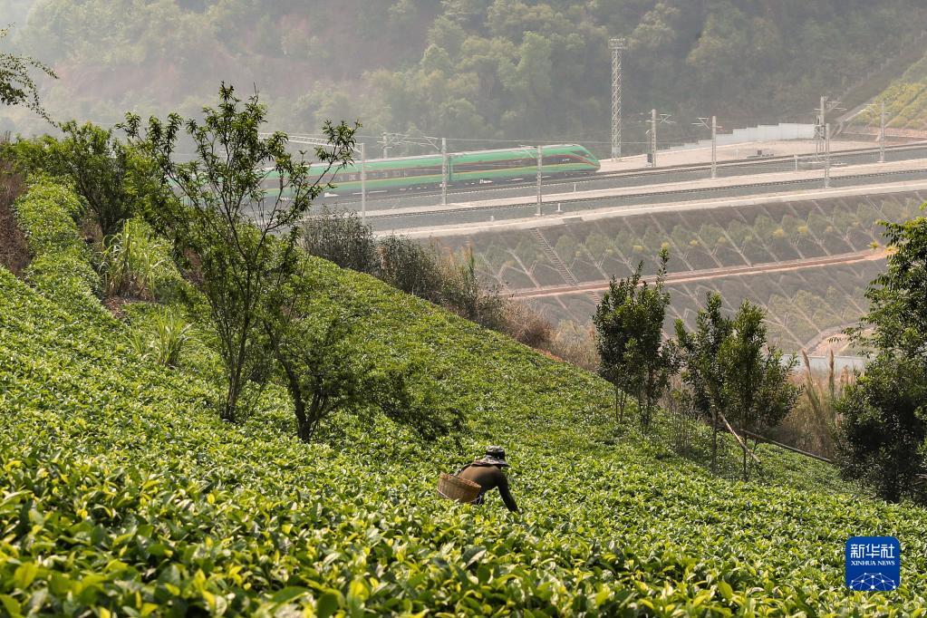 4月13日,“復興號”列車駛過云南省普洱市的一座茶山。