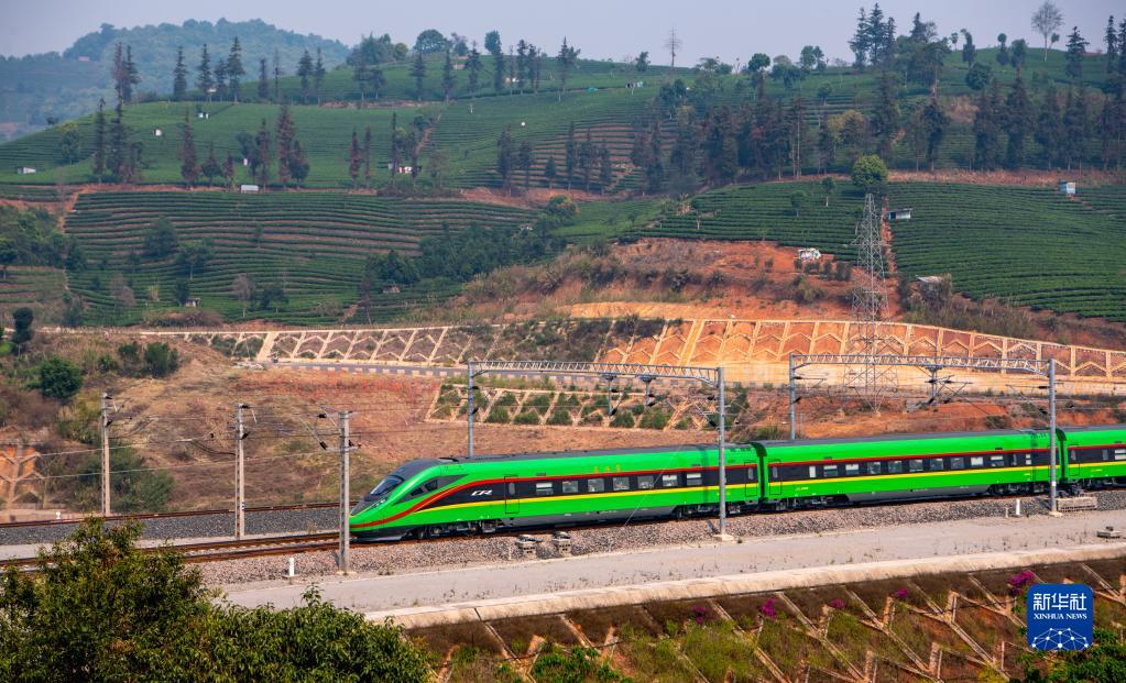 4月13日,首發列車駛過位于云南省普洱市的一處茶山。