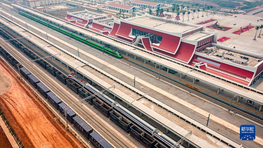 4月13日,“復(fù)興號(hào)”(左上)、“瀾滄號(hào)”動(dòng)車組列車(中)停靠在中老鐵路磨憨站(無人機(jī)照片)。