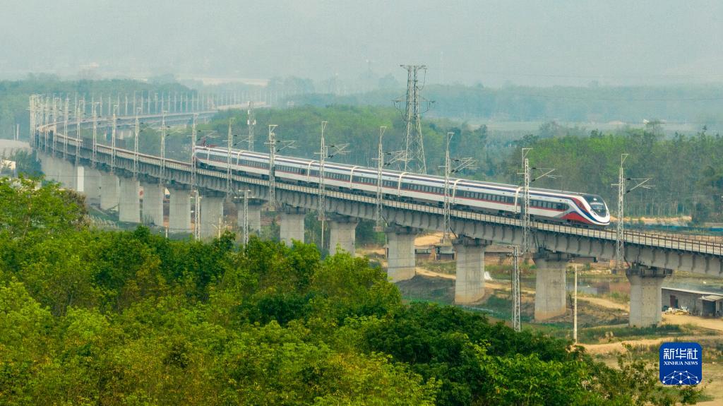 4月13日,從老撾萬象站駛出的D888次“瀾滄號”列車行駛在云南省西雙版納州境內(nèi)的中老鐵路橄欖壩特大橋上。