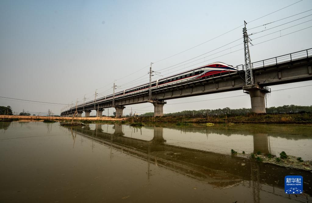 4月13日,從老撾萬象站駛出的D888次“瀾滄號”列車行駛在云南省西雙版納州境內的中老鐵路橄欖壩特大橋上。
