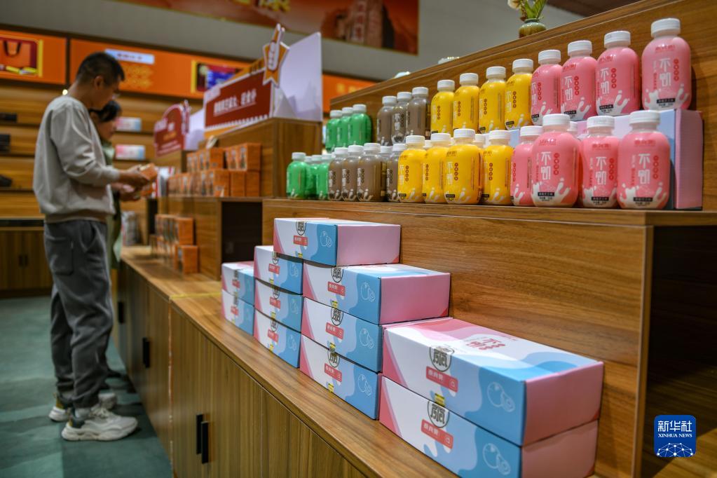 4月12日,在泰安市岱岳區的一家黃精加工企業內,訪客在參觀種類豐富的黃精產品。
