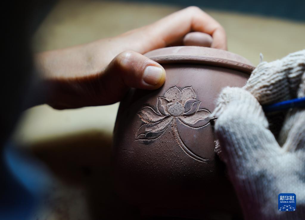 4月11日,在廣西欽州市,員工在坭興陶生產車間進行雕刻工作。