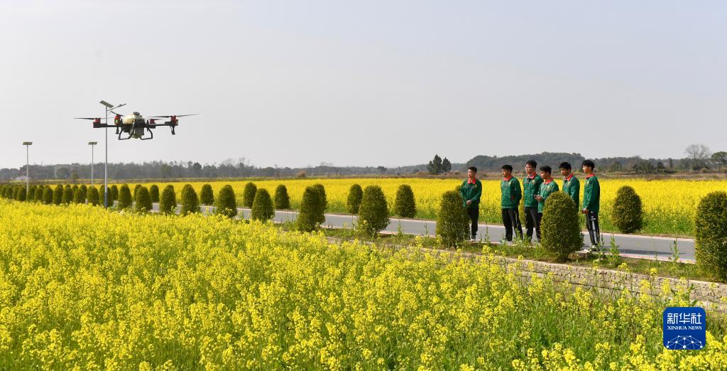 3月7日,黃從明的團(tuán)隊(duì)操控?zé)o人機(jī)在油菜田噴施肥料。
