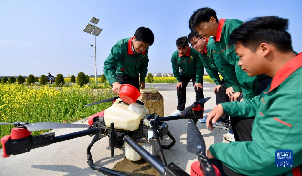 3月7日,黃從明(左一)將肥料倒至無人機的儲物箱內,準備對油菜田噴施肥料。